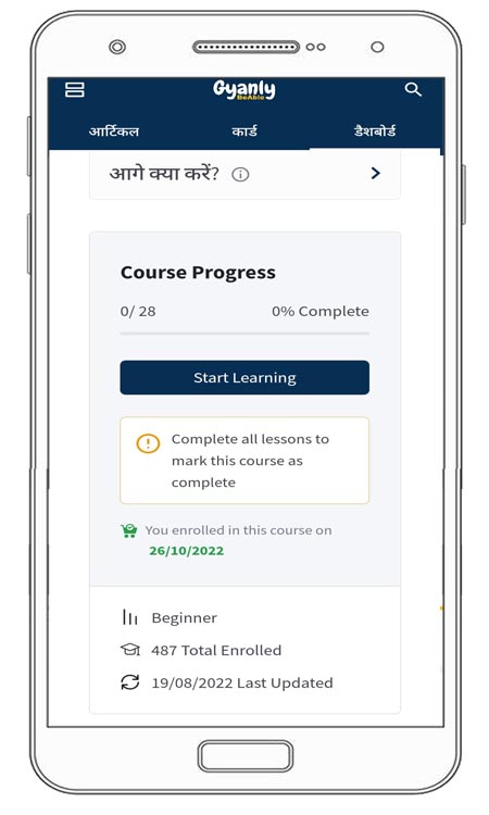 स्क्रॉलिंग के बाद आपके सामने Course Progress नाम से एक बॉक्स आएगा. इस बॉक्स में आपने इस कोर्स में कब एडमिशन लिया उसका समय के साथ एक “Start Learning” बटन और मिलेगा. क्लास लेने के लिए आप इस बटन को टच करें.